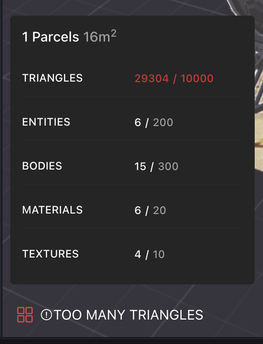 Important: Only entities that are currently being rendered in the scene are counted for these limits. If your scene switches between 3D models, what matters is the rendered models at any point in time, not the total sum. Player avatars and any items brought by a player from outside the scene don’t count for calculating these limits either.